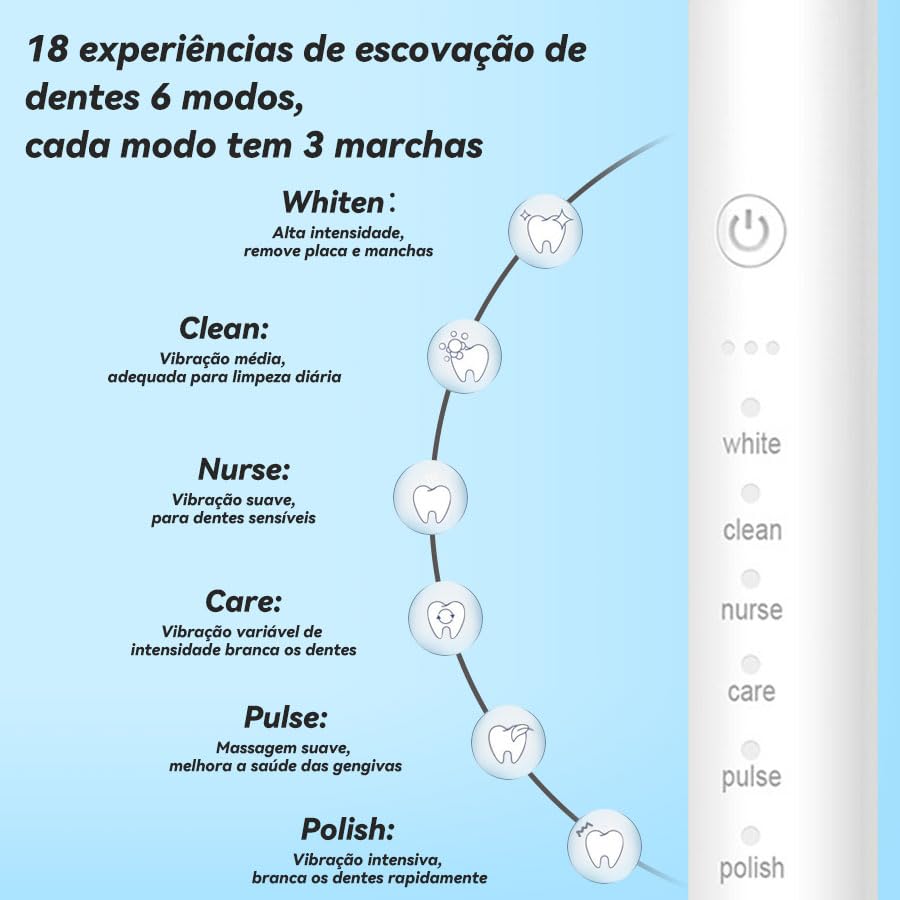 Escova de Dentes Elétrica Tem o Nível de Resistência à Água IPX7, um Temporizador Embutido de 2 minutos e 6 Modos Opcionais, Totalizando 18 Níveis. Inclui 4 Cerdas de Escova de Dentes e um Suporte