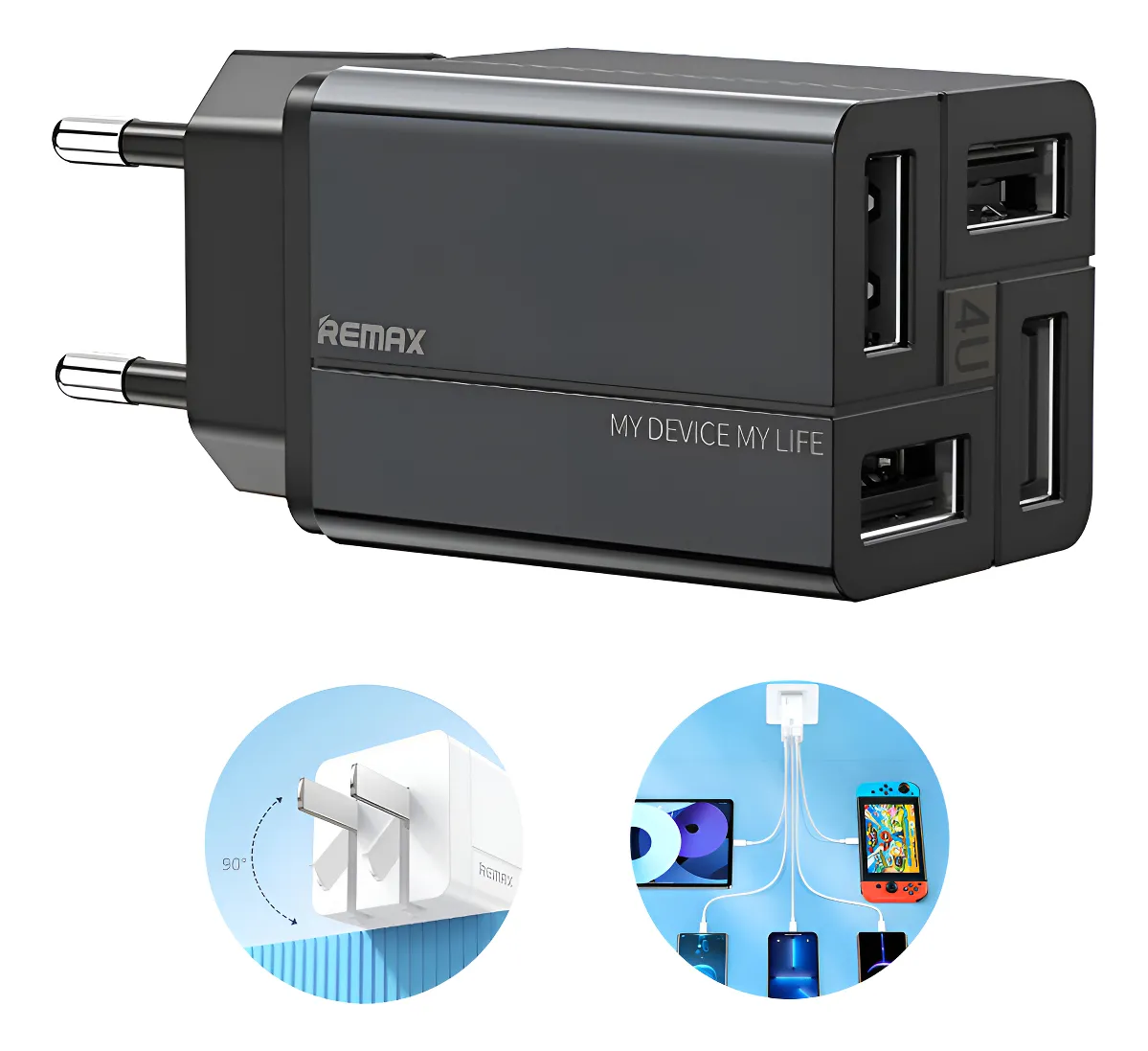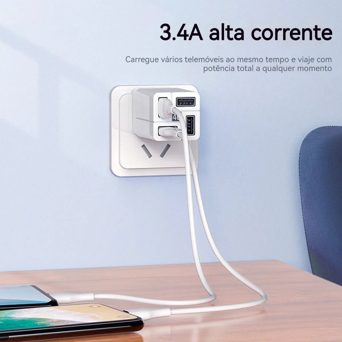 - 4 Portas USB: Permite carregar vários dispositivos ao mesmo tempo, atendendo às necessidades de você, sua família ou colegas e aumentando a eficiência.