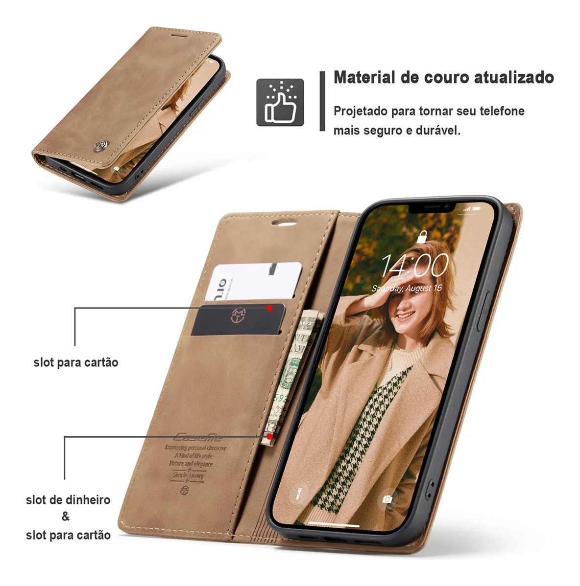 Um dos destaques desta capa é sua versatilidade. Além de ser uma proteção eficaz, também serve como uma carteira ultrafina graças ao seu engenhoso design de compartimentos para cartões. Agora você pode carregar seus cartões essenciais de forma segura e elegante, sem a necessidade de uma carteira separada.