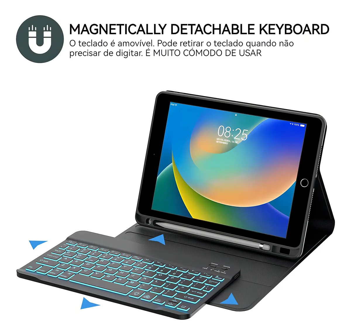 O conjunto não só oferece proteção total, como também aumenta sua produtividade com o teclado iluminado, tornando seu iPad mais funcional e prático.