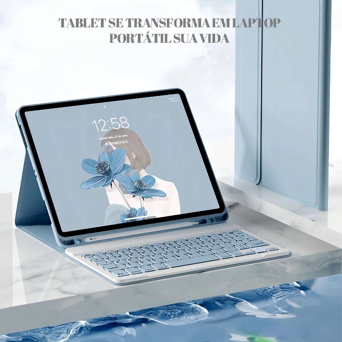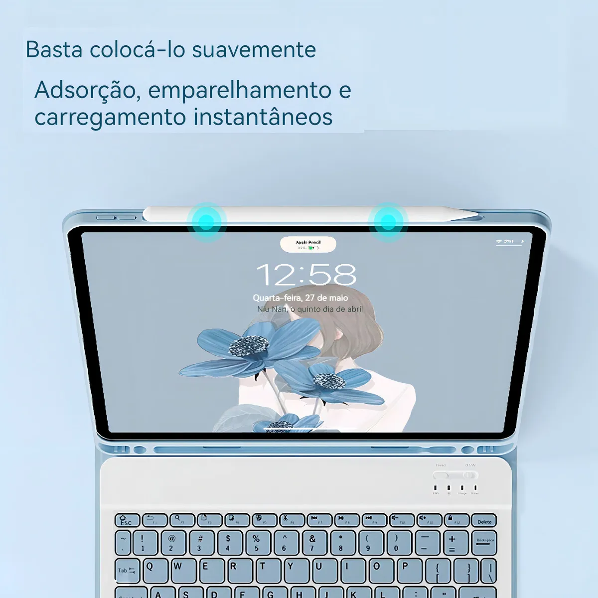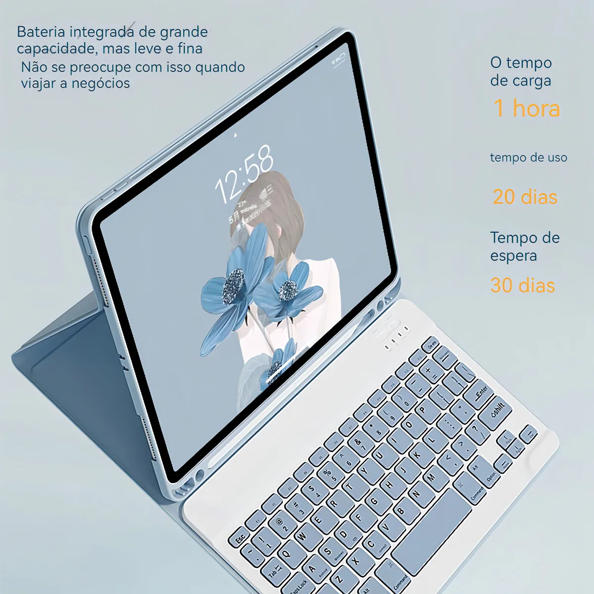 2. Teclado Bluetooth Removível: Teclado fino e leve que se conecta ao seu iPad via Bluetooth, oferecendo uma experiência de digitação confortável e eficiente.