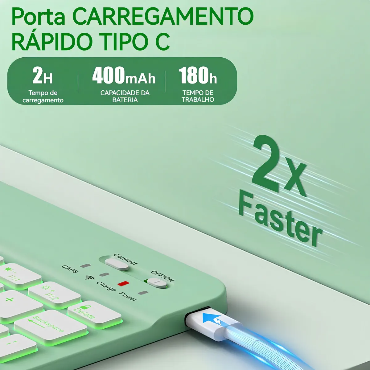 Lembrete: Não use o protocolo de carregamento rápido ao carregar o teclado. Use o cabo de carregamento que fornecemos ou um cabo de carregamento comum. Corrente excessiva no protocolo de carregamento rápido causará falha do IC, tornando o teclado inutilizável.