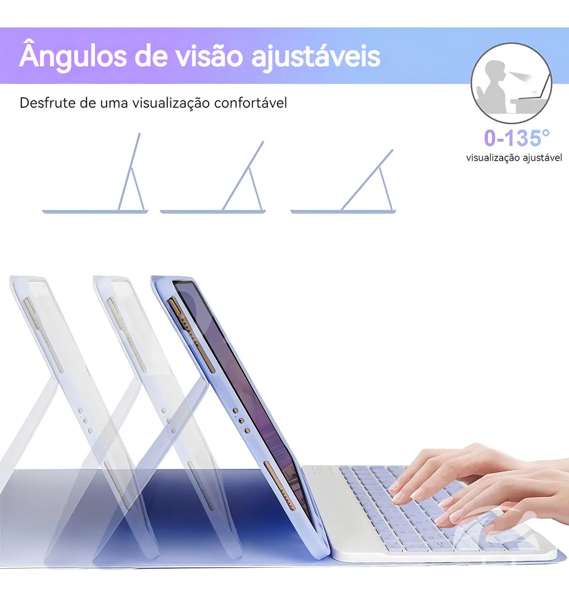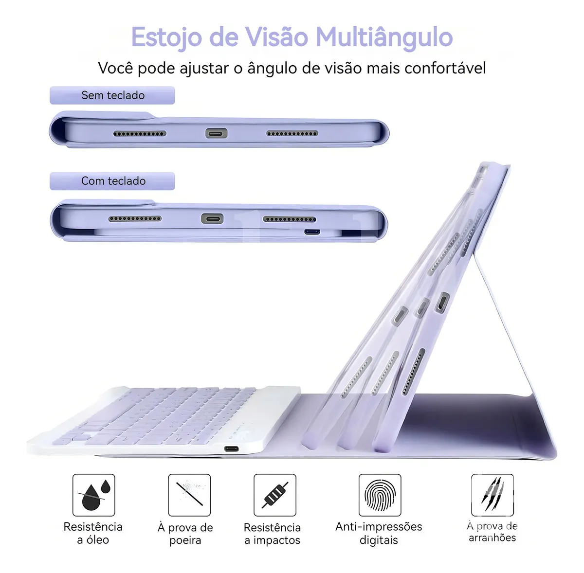 O design modular apresenta um teclado removível que transforma seu iPad em um laptop ou seu livro favorito em menos de um segundo. No modo portátil, o design inteligente ajusta-se facilmente a qualquer ângulo confortável. Perfeito para trabalhar, escrever ou assistir a vídeos no trabalho, na escola, em viagens e em casa.