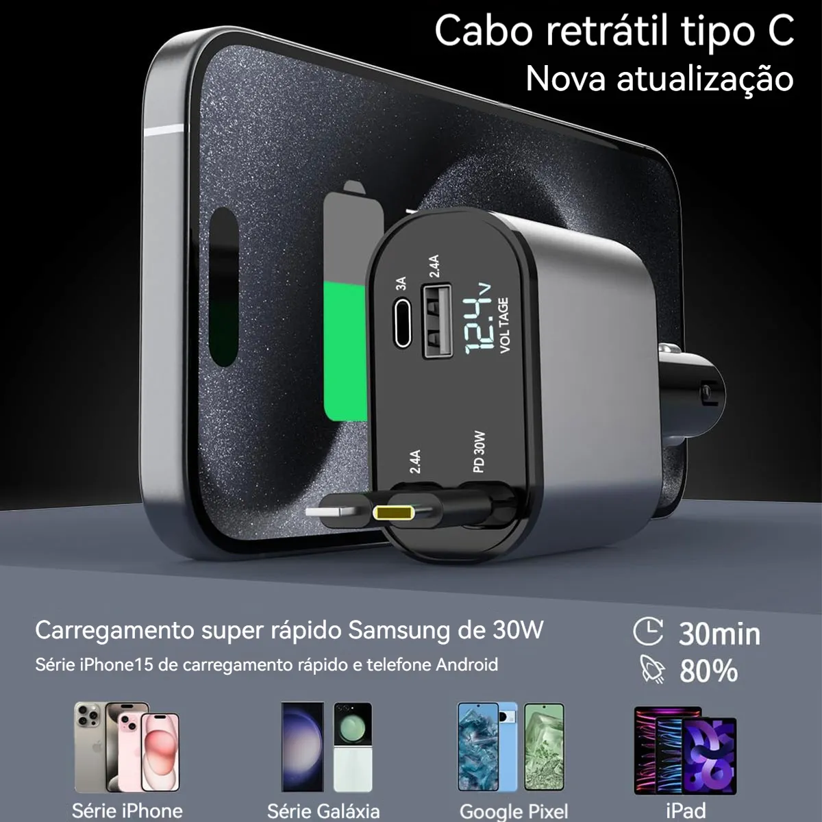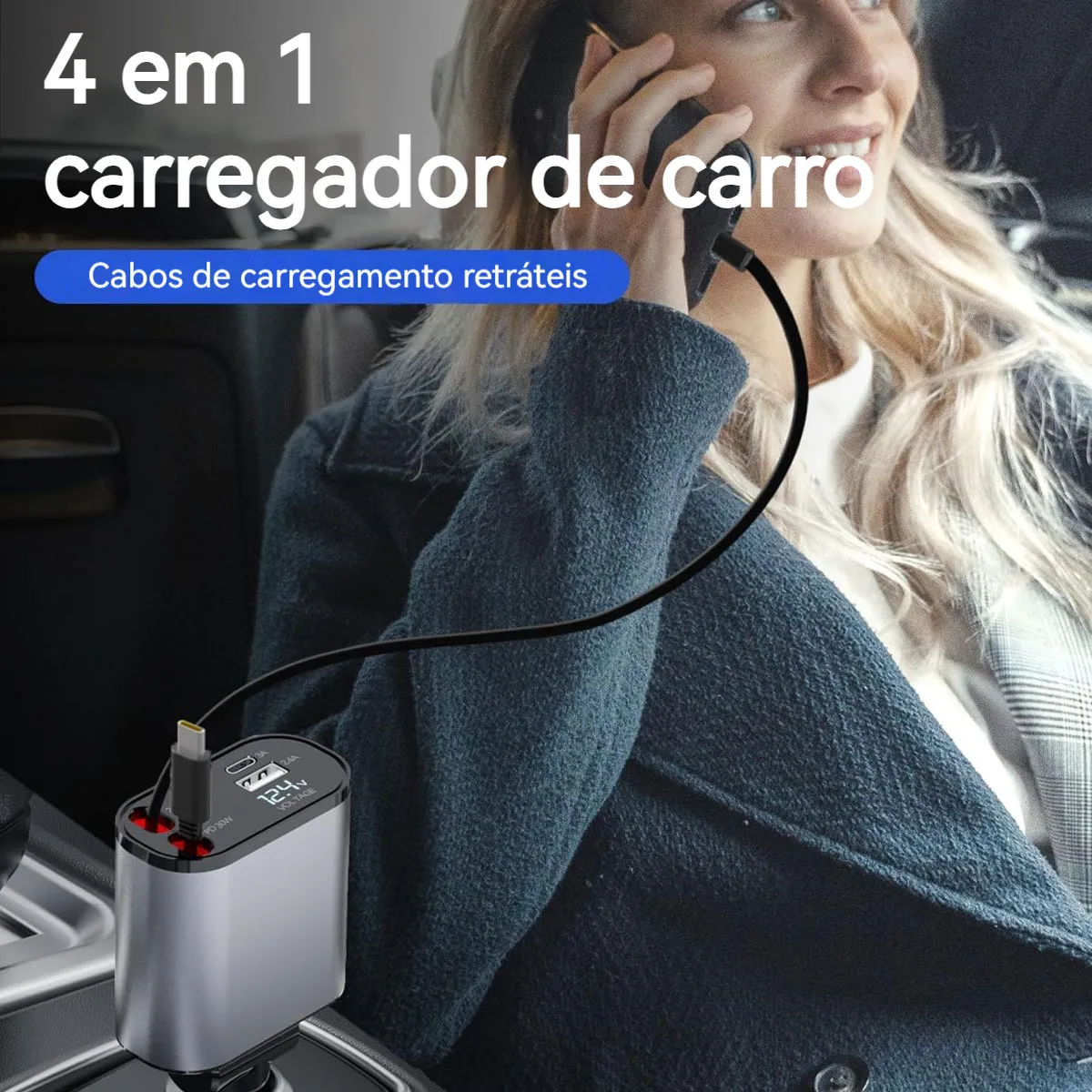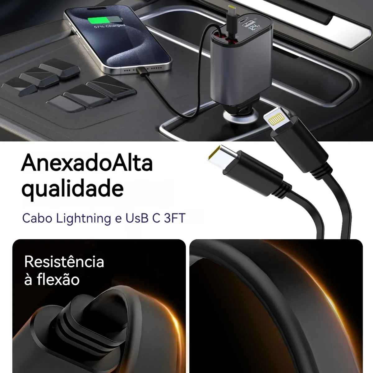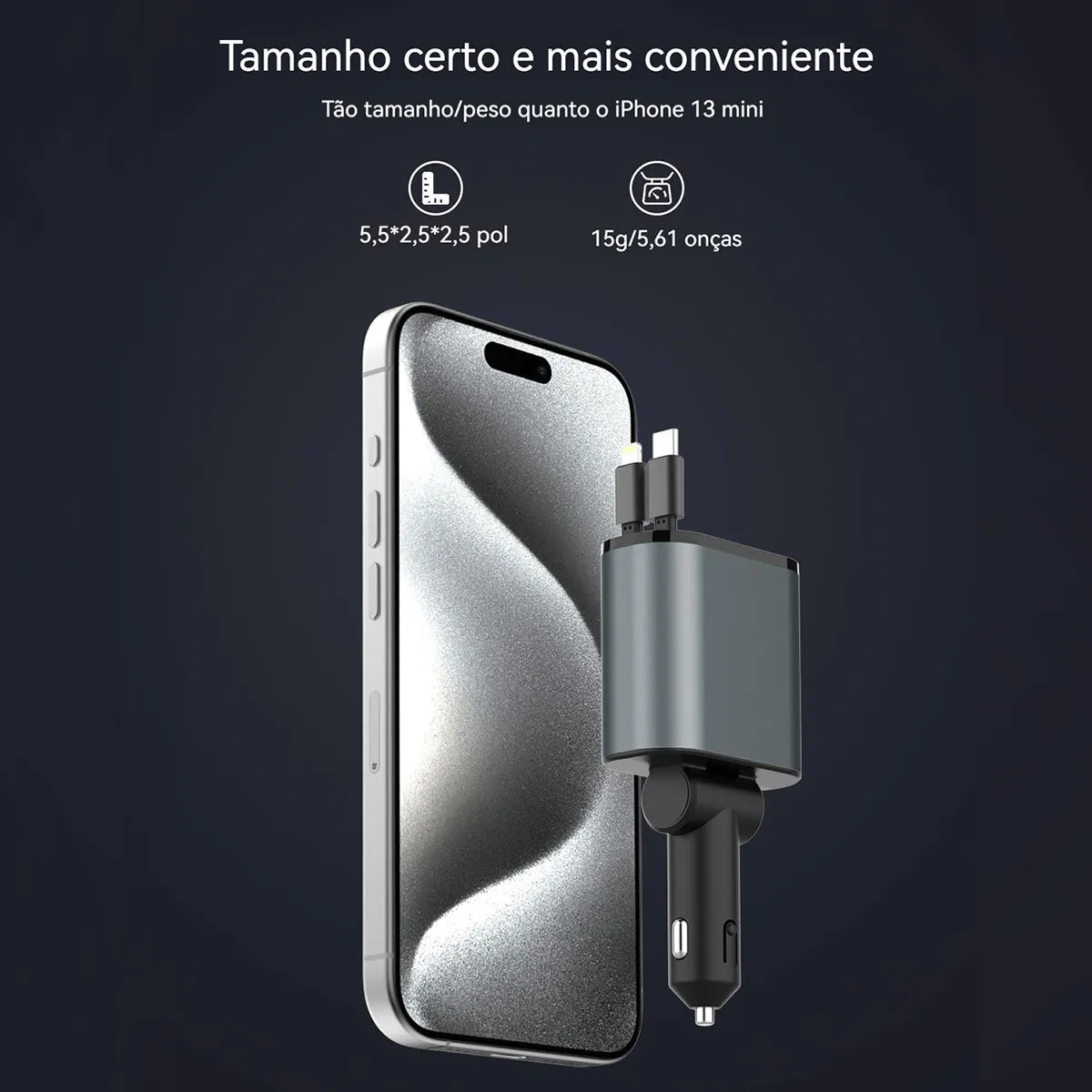 Para deixar seu carro mais organizado, apresentamos o novo carregador veicular 4 em 1, equipado com dois cabos retráteis que podem se estender até 80 centímetros e possuem função de recolhimento automático para facilitar o armazenamento, eliminando a bagunça de cabos no interior do carro. Além disso, atualizamos o conector do carregador veicular para permitir ajuste de ângulo, com rotação de até 180°, proporcionando mais conveniência ao carregar seus dispositivos, mesmo no banco traseiro.
