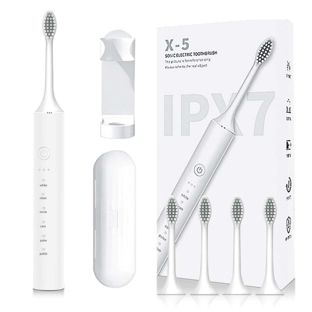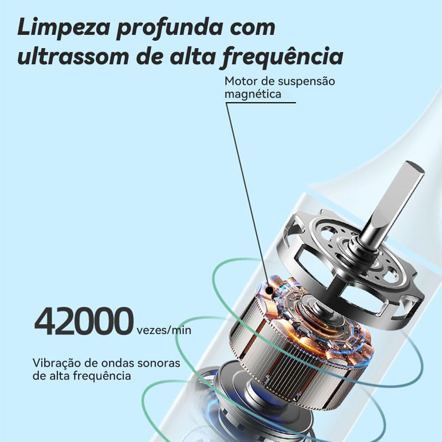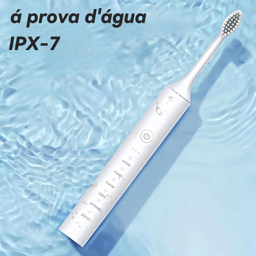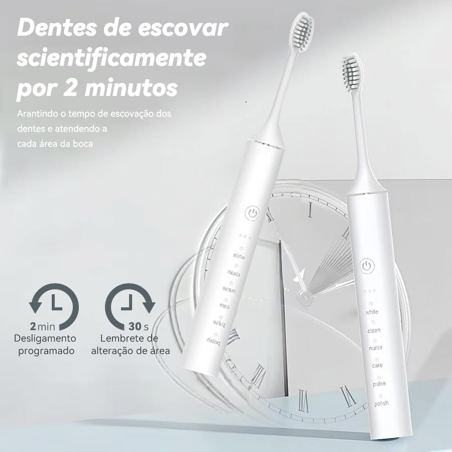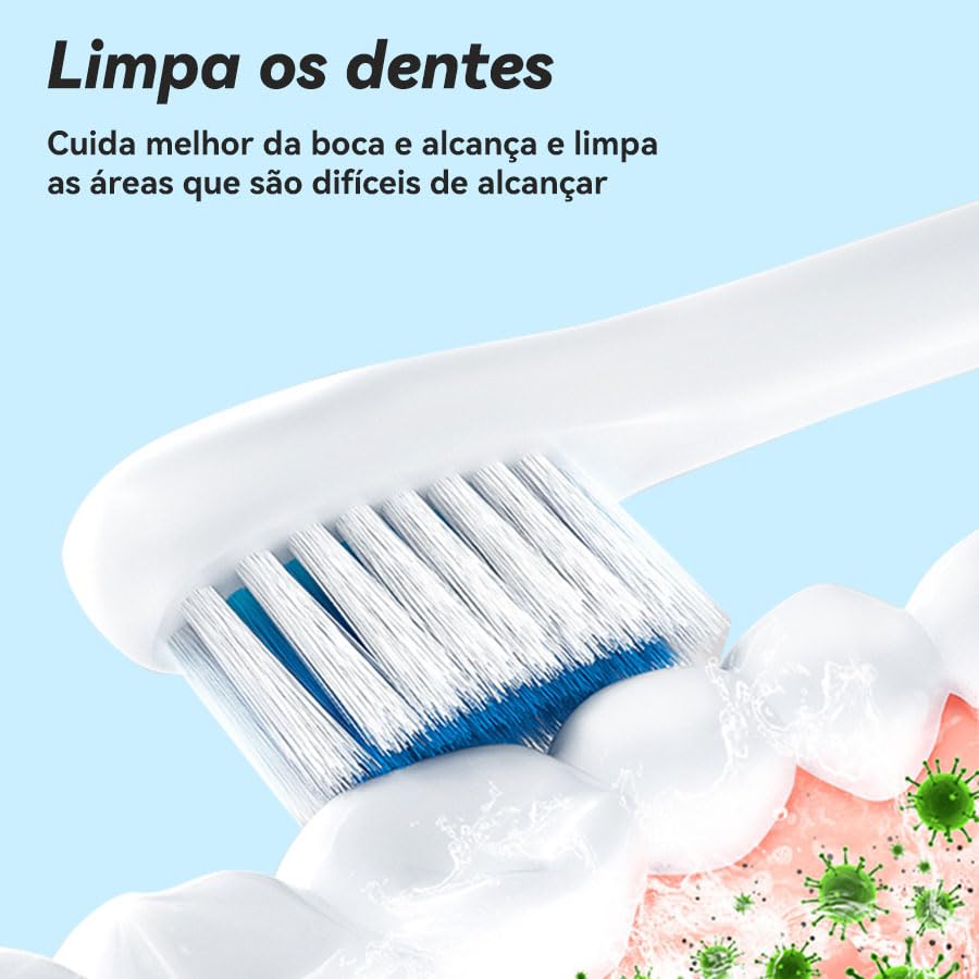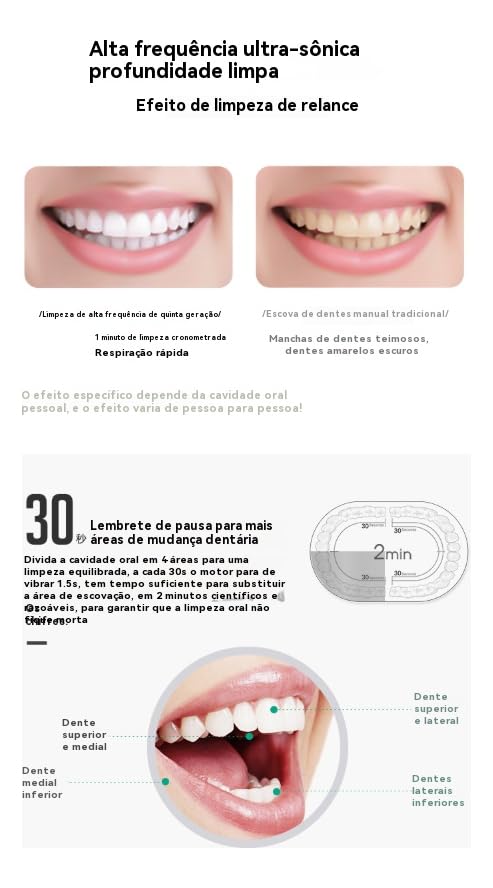 ——Informações de Segurança ——É recomendado supervisionar as crianças durante o uso. Não use a escova de dentes elétrica enquanto está banhando ou tomando banho. Substitua a cabeça a cada 2 meses. ——Instruções ——Molhe as cerdas da cabeça da escova de dentes elétrica. Aplique uma pequena quantidade de pasta de dente. Aplique as cerdas dos dentes a um ângulo de 45° em direção à linha gengival. Pressione o botão de energia para começar a escovar os dentes. Aplique leve pressão e mova a cabeça da escova lentamente sobre os dentes em movimentos pequenos para frente e para trás, de modo que a escova realize todo o trabalho. Mantenha esse movimento durante todo o processo de escovar os dentes. Observação: Para mais informações, consulte o manual do produto. ——Conteúdo do Pacote: 1 unidade de escova de dentes elétrica sônica. 4 refil de cabeças de escova de dentes. 1 manual do usuário (versões em chinês e inglês). 1 cabo de carregamento específico 1 suporte para escova de dentes.