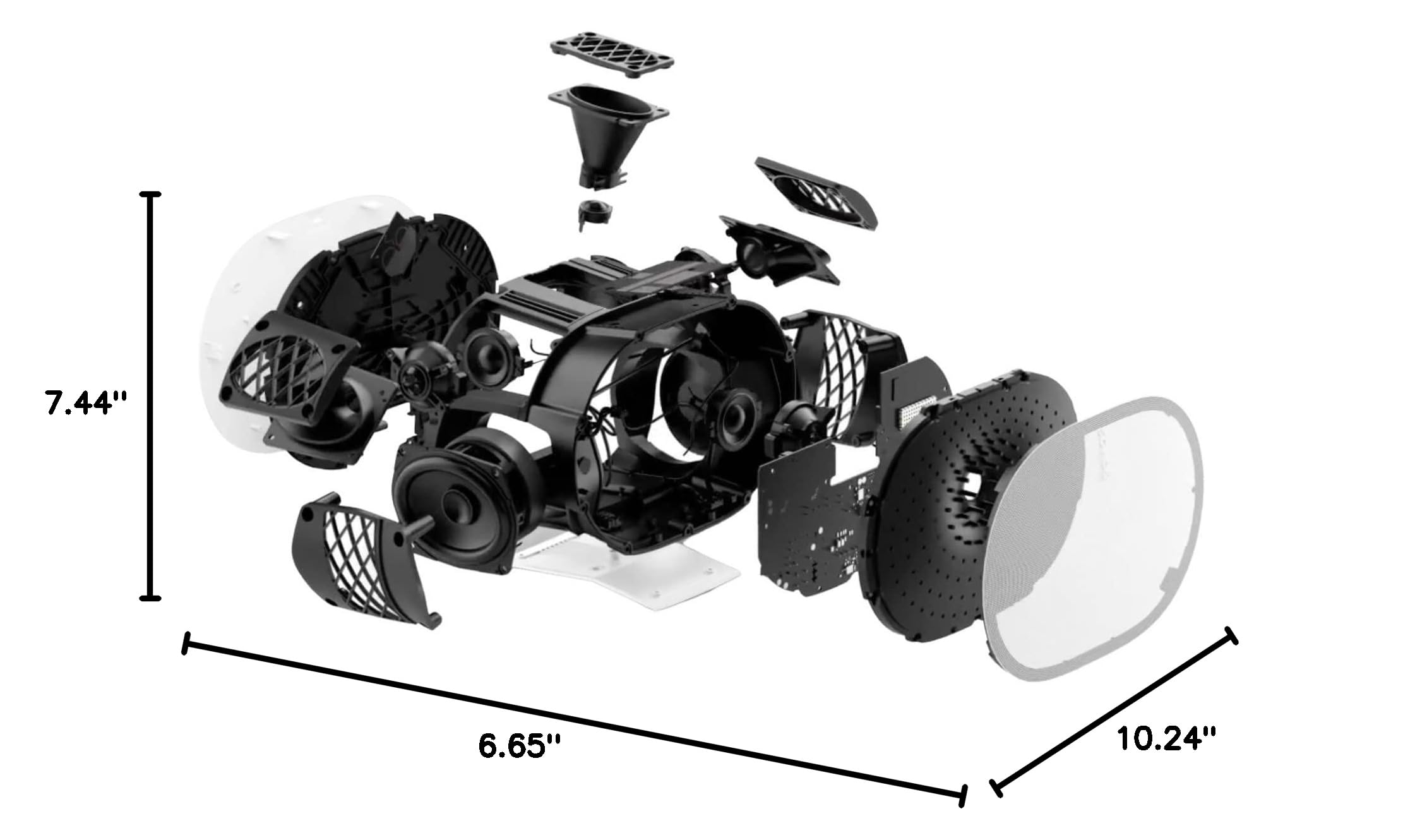 Com seis drivers posicionados de forma otimizada na frente, laterais e parte superior para suportar o Dolby Atmos Music, o projeto acústico inovador projeta o som de parede a parede e de chão a teto, imersando você em todas as dimensões da música.