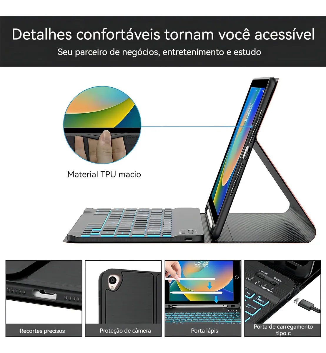 Esta capa protetora com teclado iluminado e mouse Bluetooth é a solução perfeita para aqueles que buscam eficiência e conveniência, transformando o seu iPad em uma poderosa estação de trabalho.